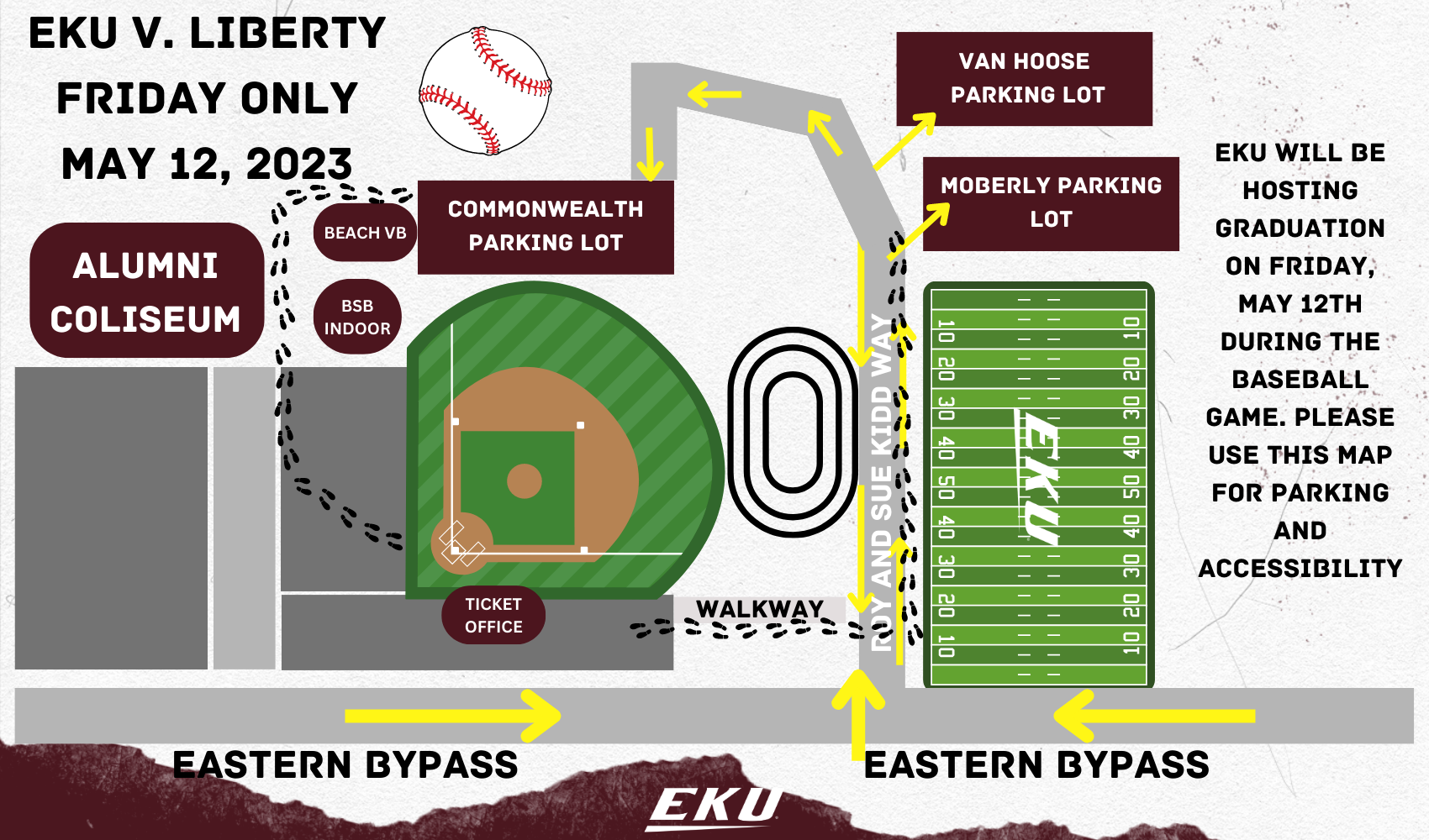 Due to EKU Commencement ceremonies taking place in Alumni Coliseum throughout the day on Friday, parking limitations are expected in the AC parking lot. Alternative parking options for fans attending the baseball game will be available in the Commonwealth Parking Lot, Moberly Parking Lot, and the Van Hoose Parking Lot (see attached map).  Normal parking options in the Alumni Coliseum lot will return for the games on Saturday and Sunday.  Please call the EKU Ticket Office at 859-622-2122 should you have any questions.